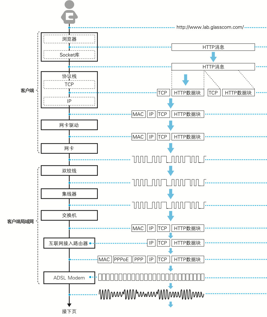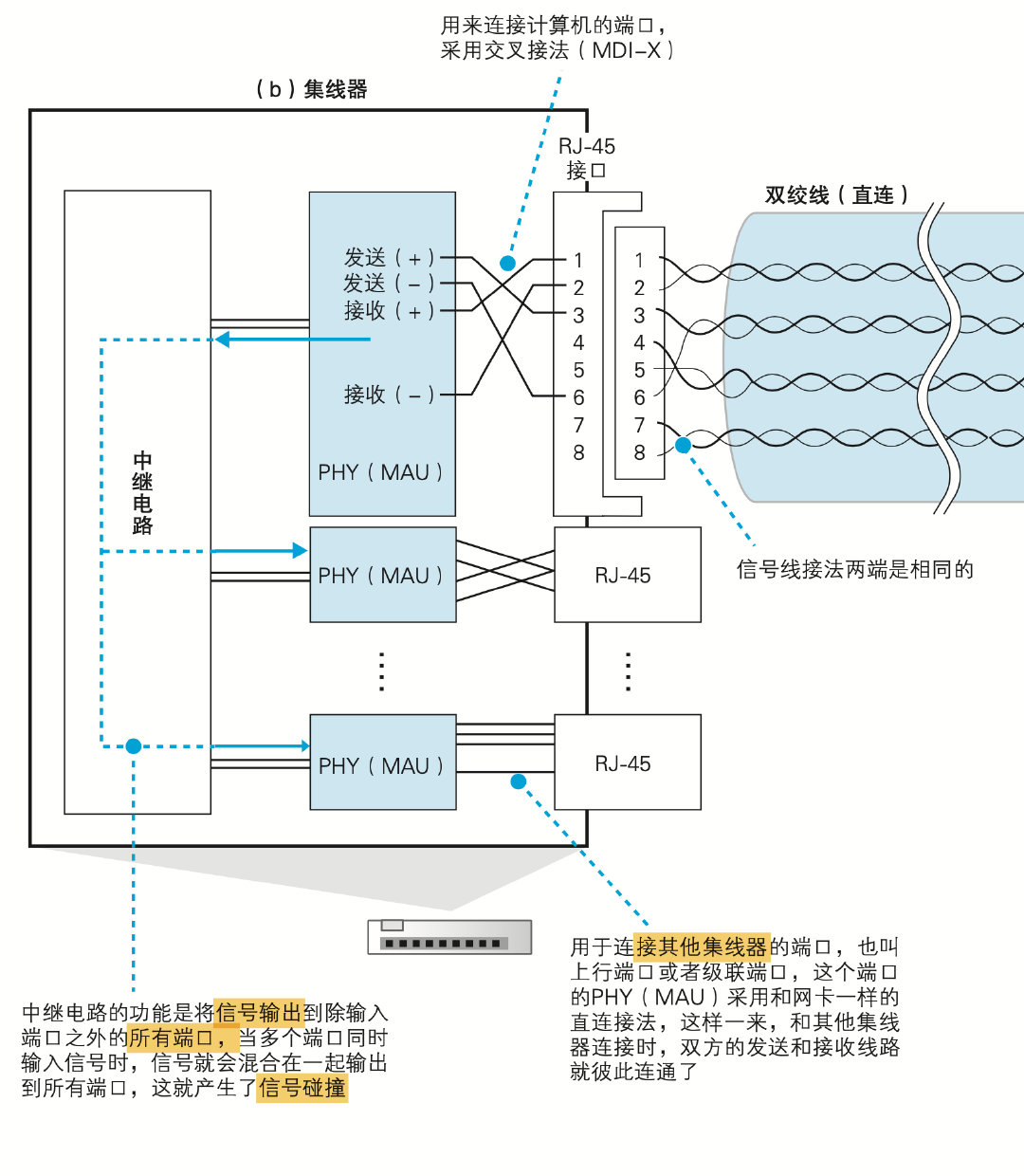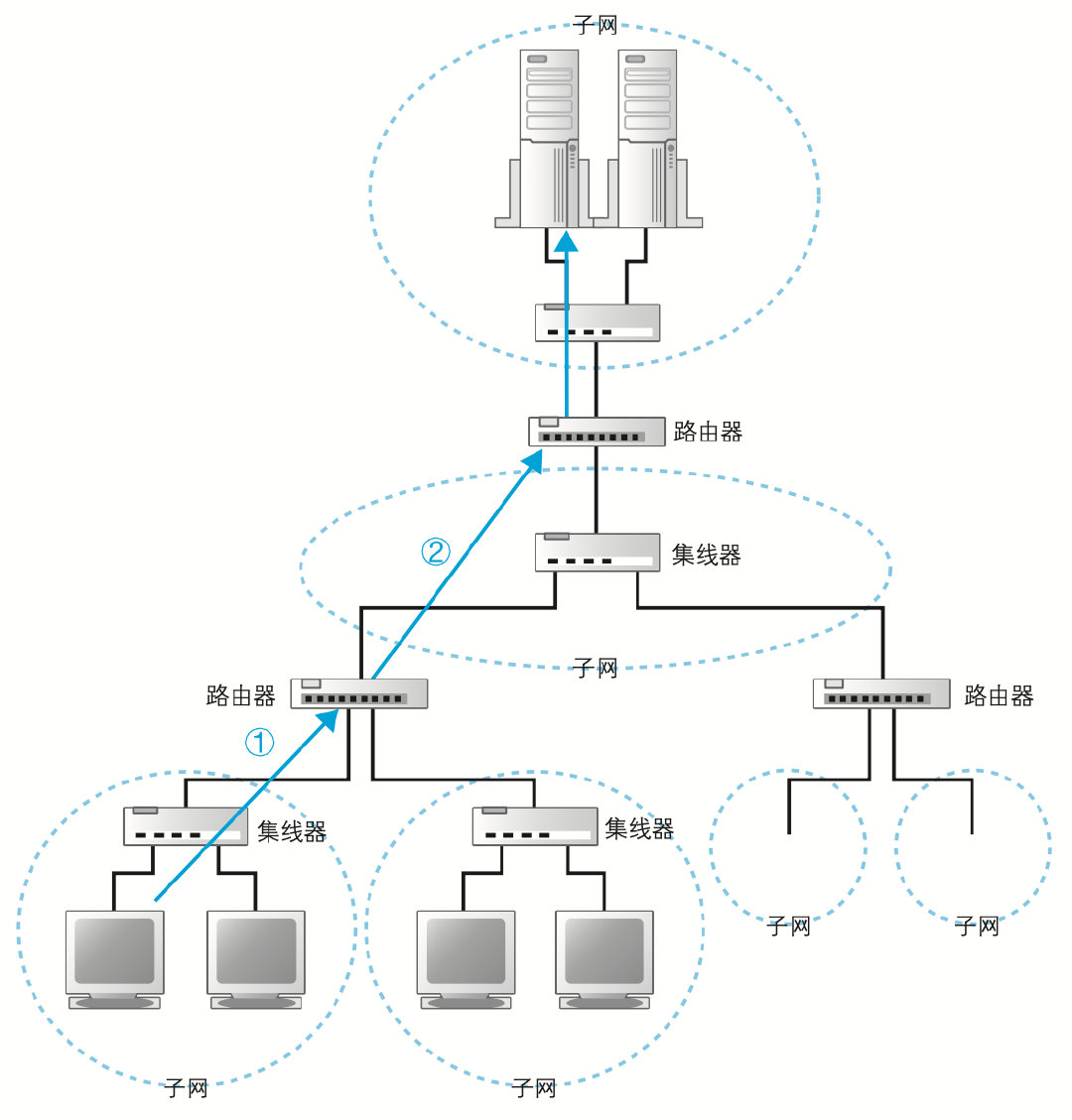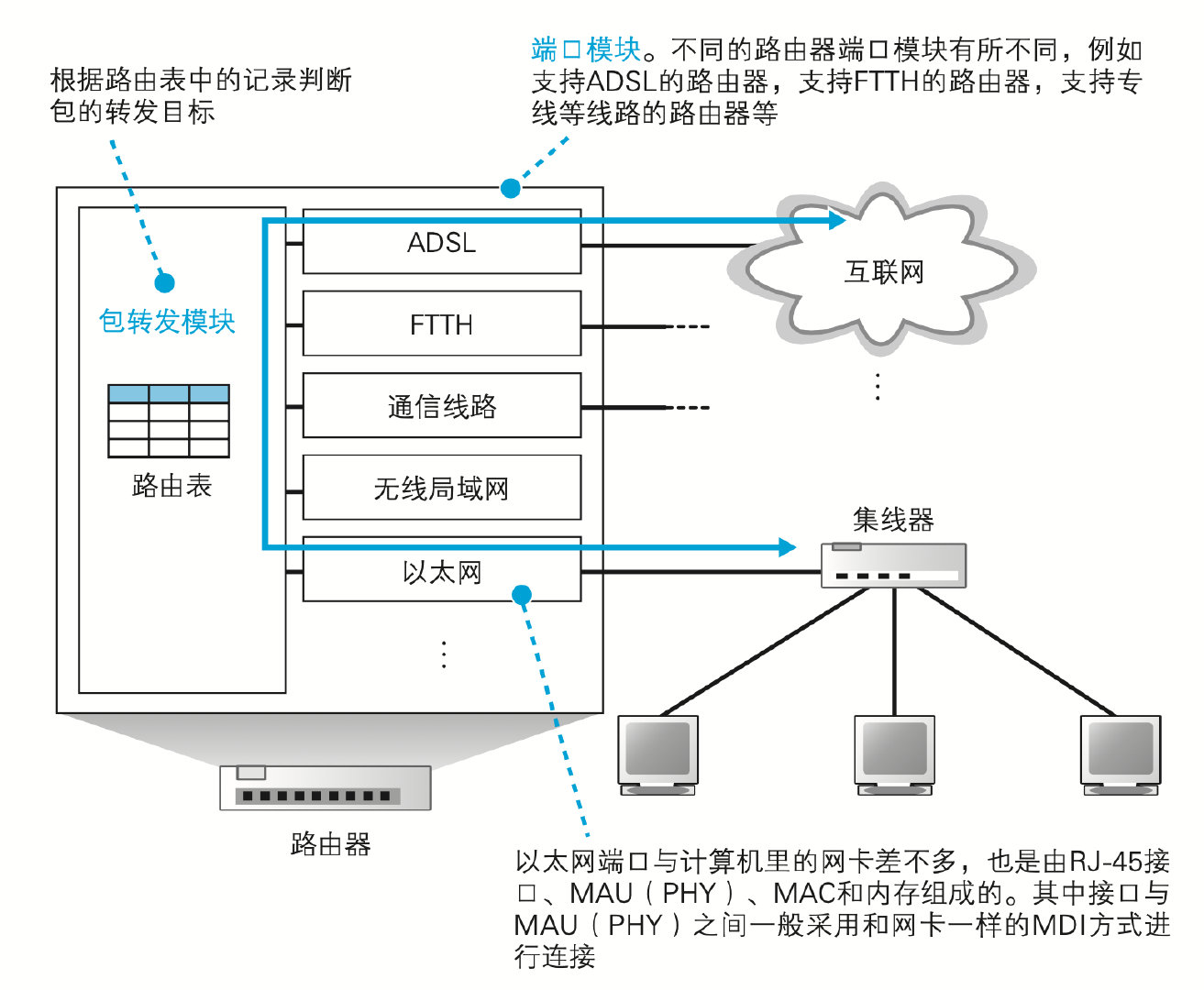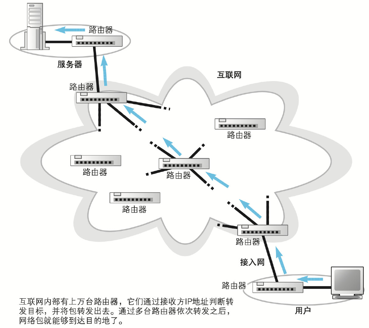 数据从计算机发出,到集线器,转发到最近的路由器,再转发到下一个路由器。不断转发直至到达目的地。