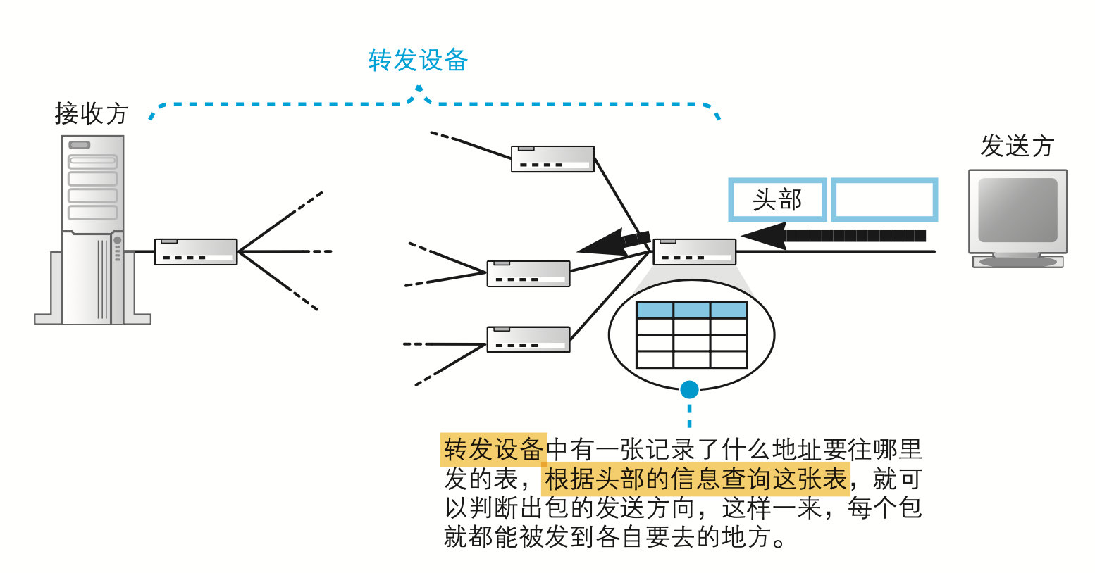 交换机和路由器相当于邮局或快递公司的分拣处理区。根据包的头部信息,来把包接力送到目的地。