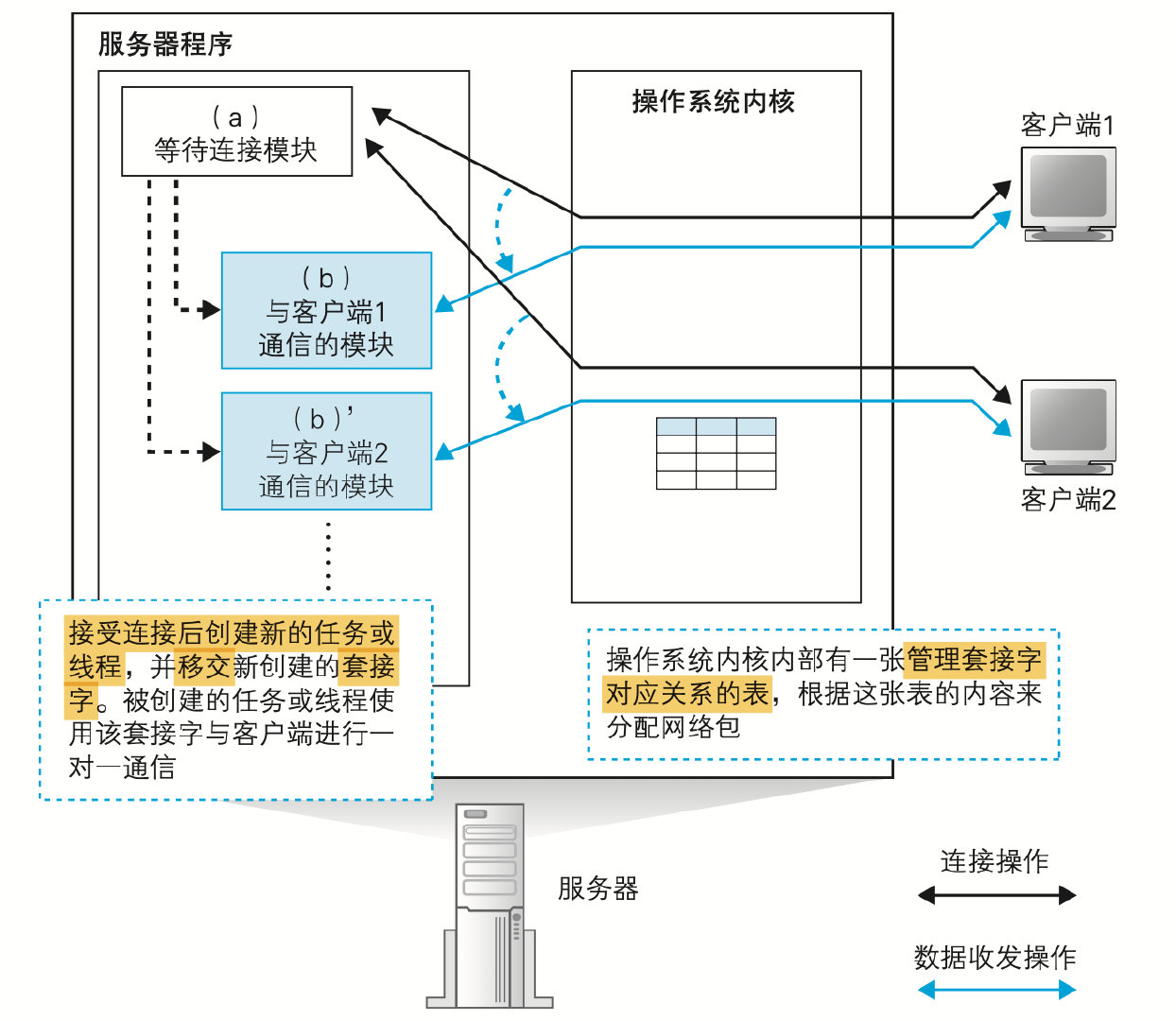 客户端发起连接,启动通信模块,复制一个自己然后移交连接的套接字。